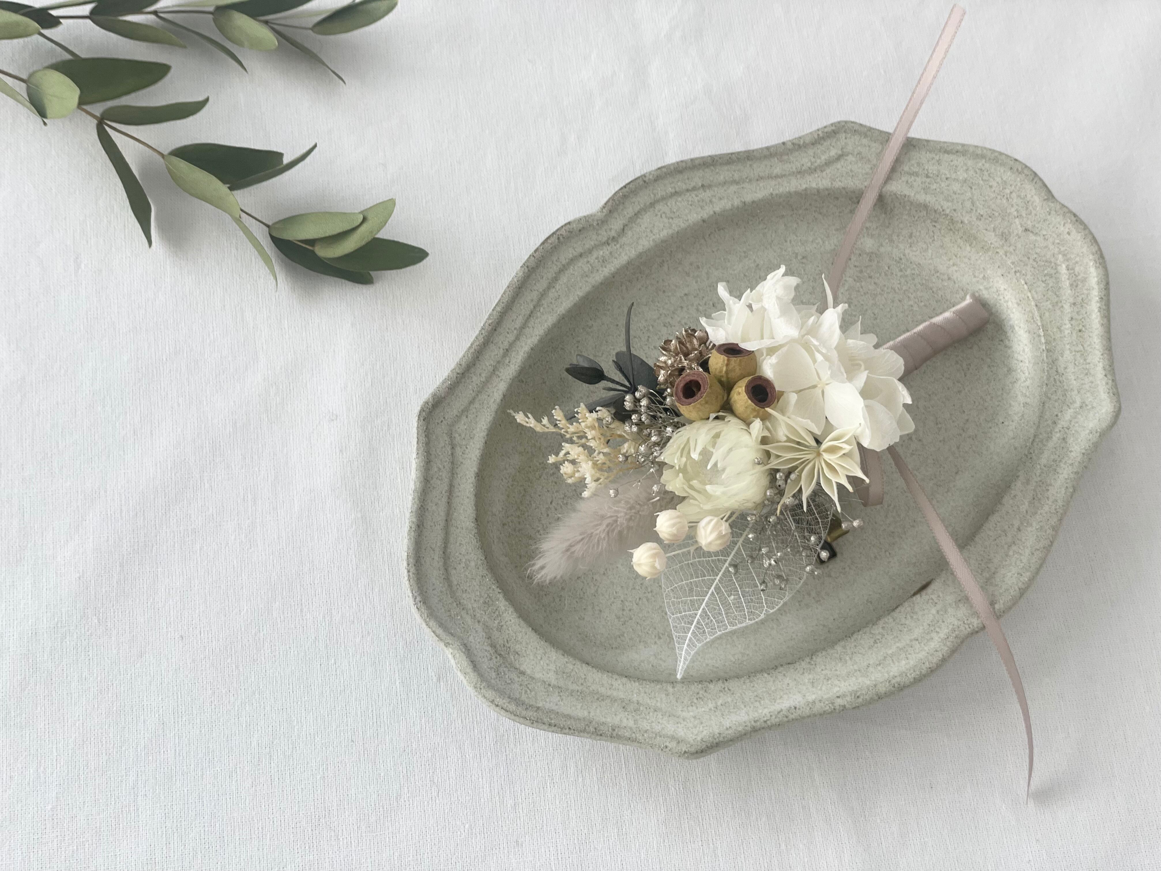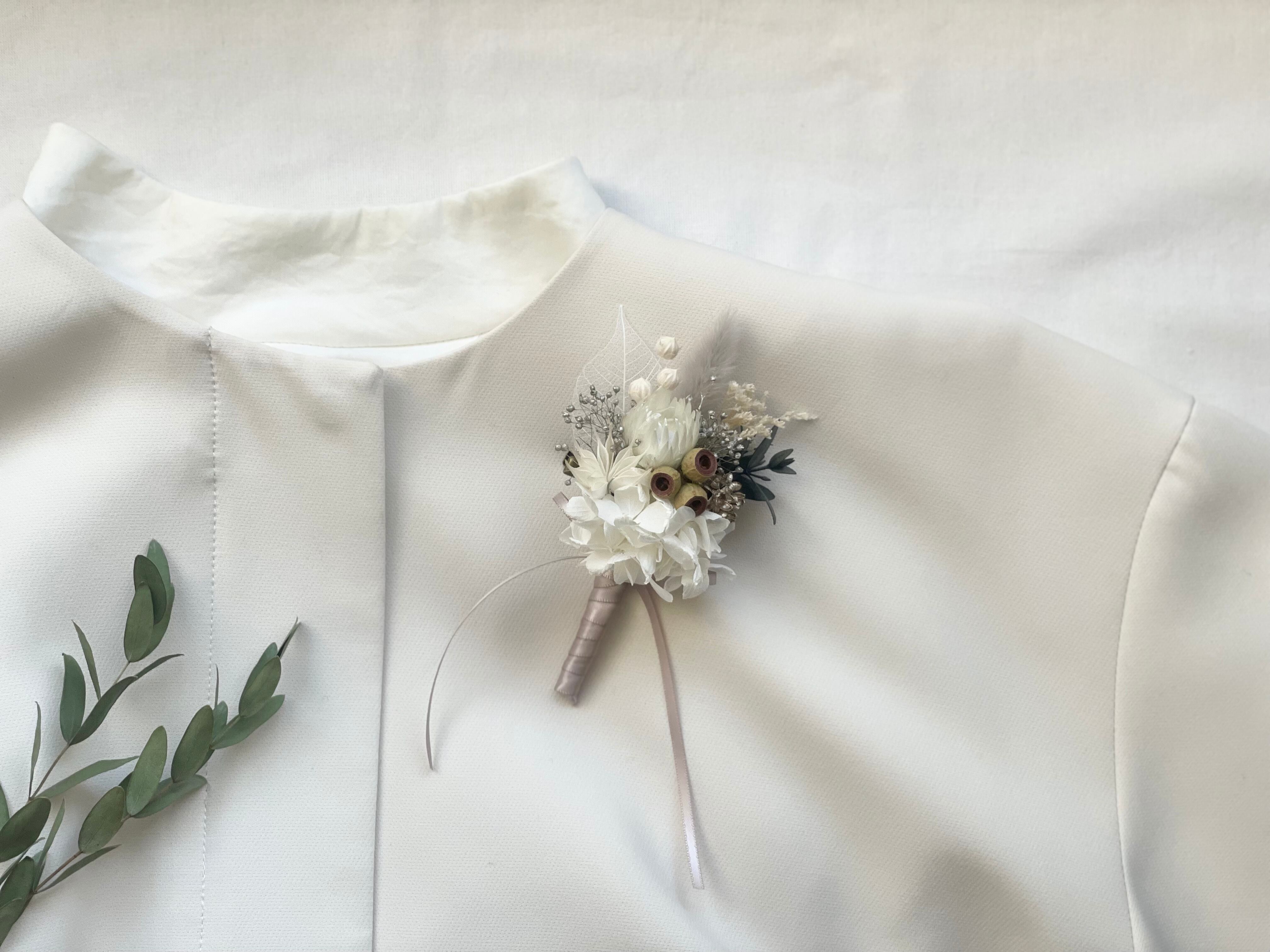 ホワイトとプラチナカラーのかすみ草を使用したプリザーブドフラワーのコサージュです。