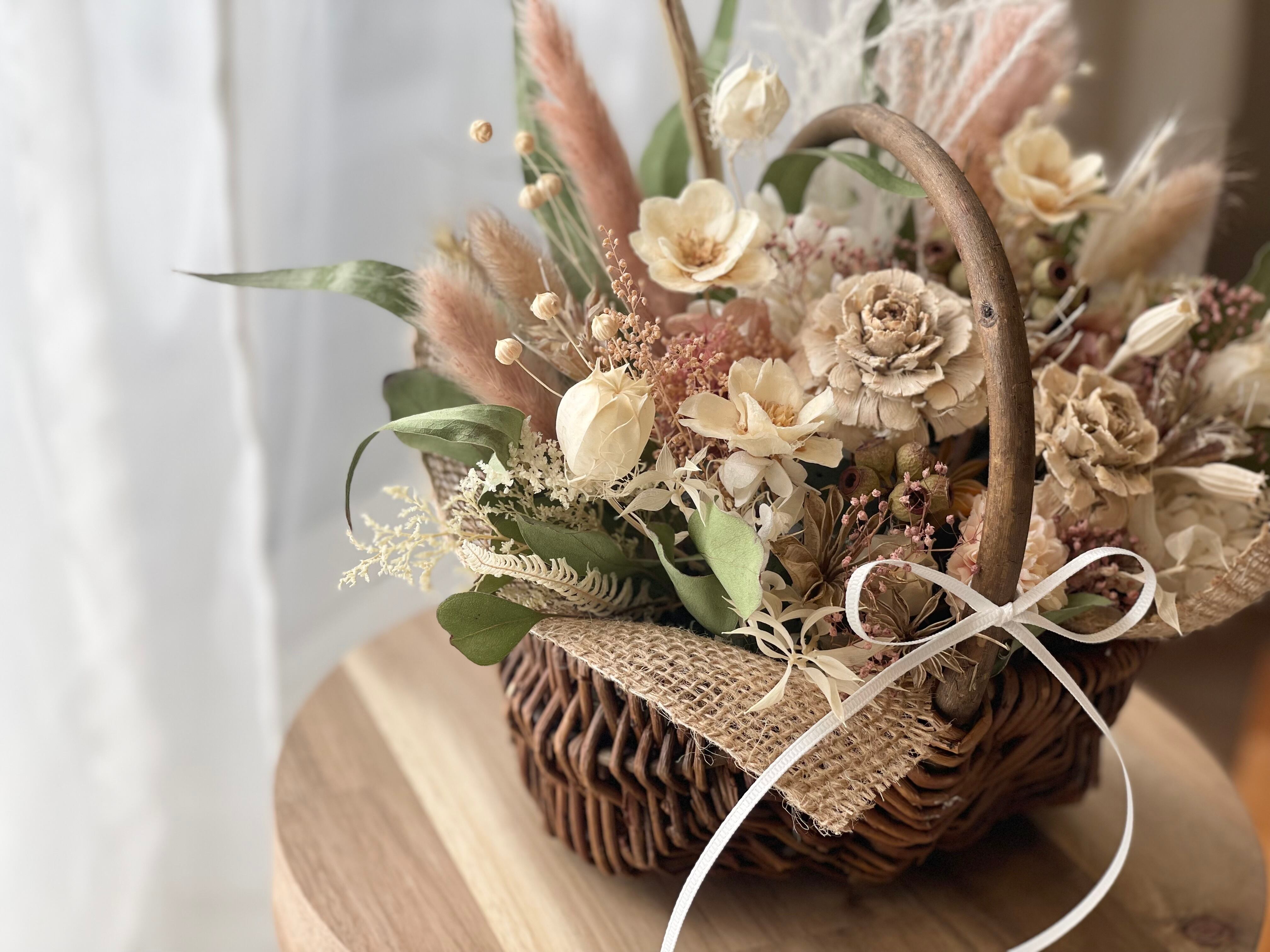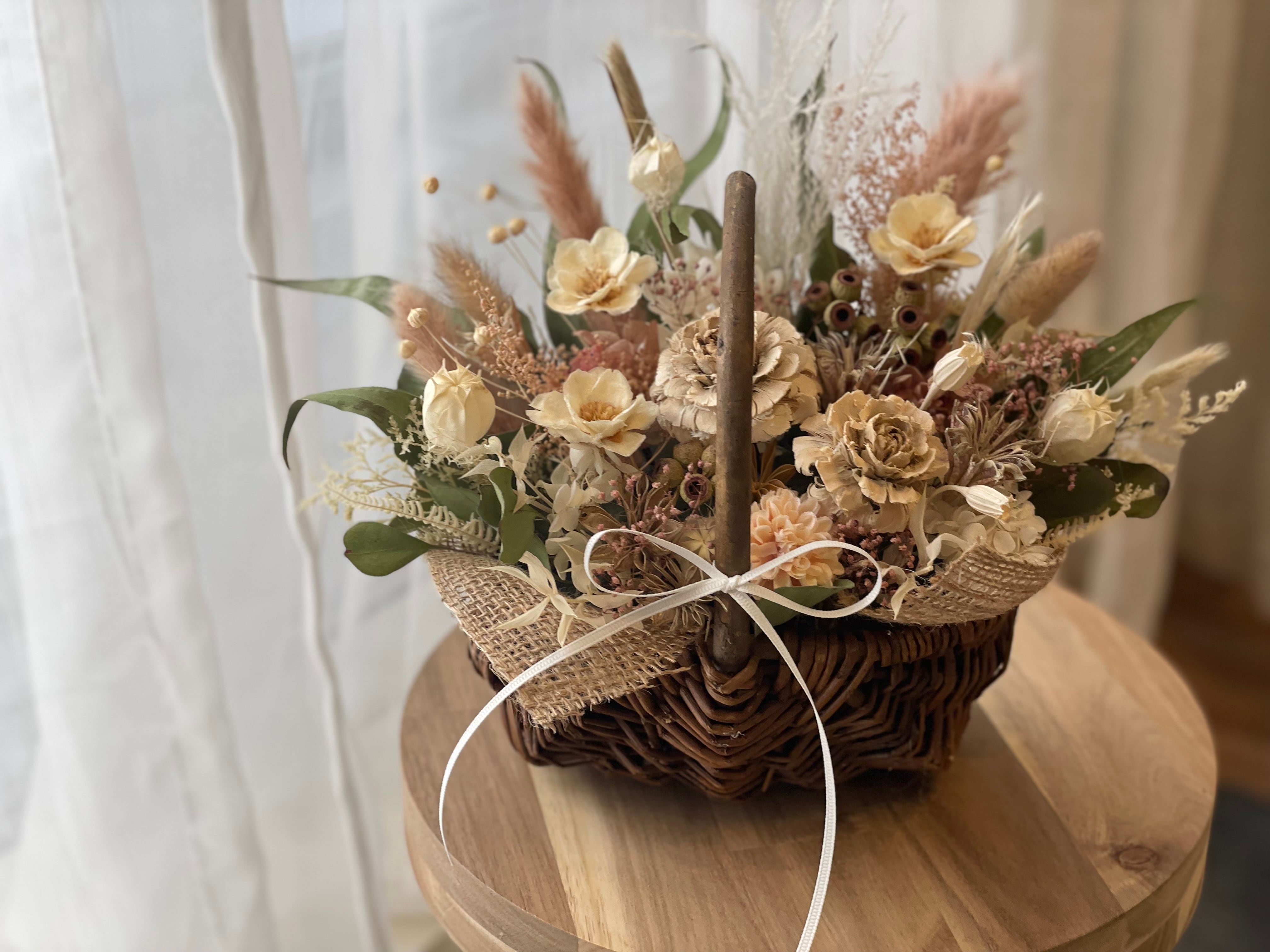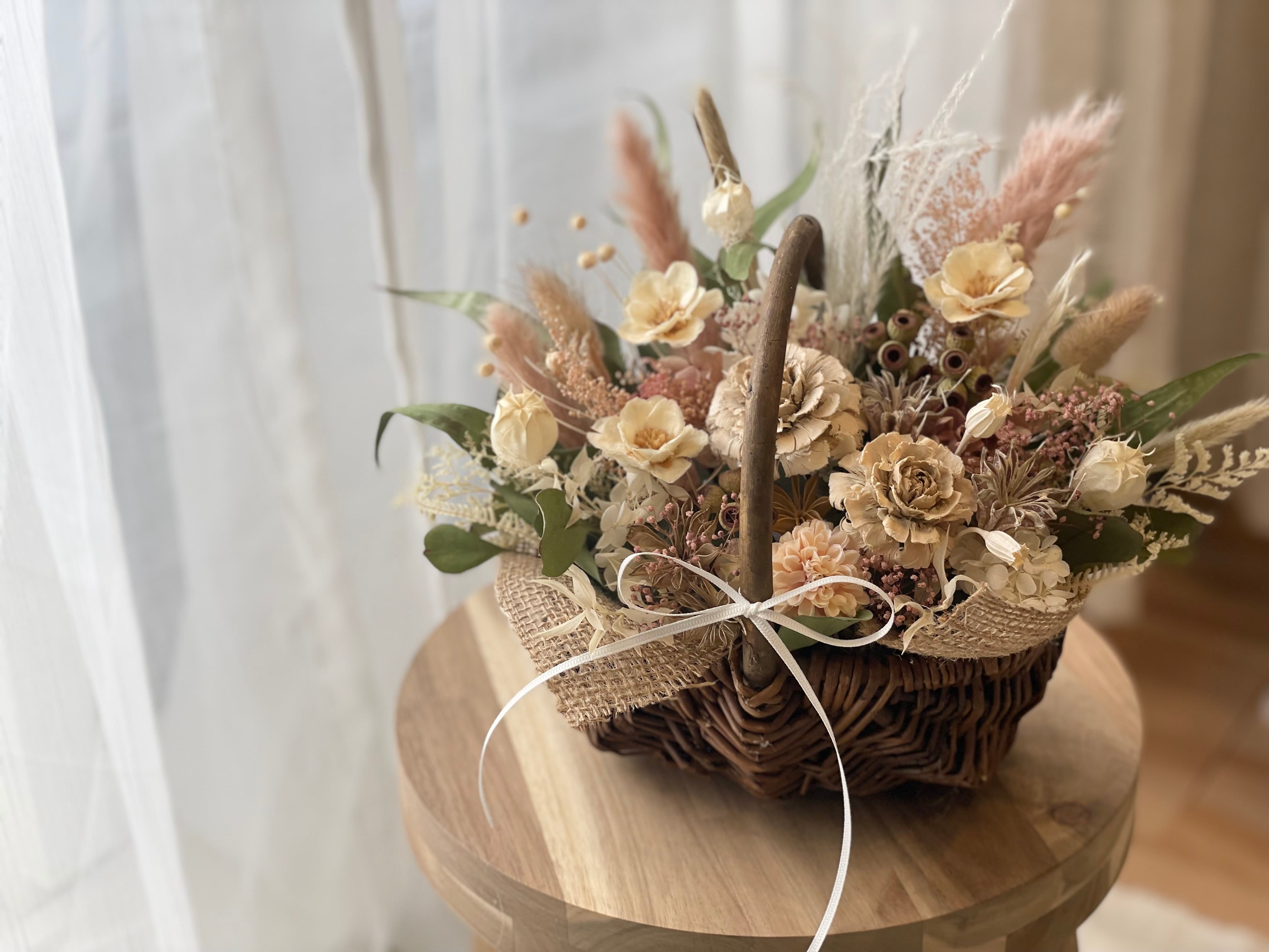 ブラウンのバスケットにくすみピンクやホワイトでナチュラルにアレンジしました。