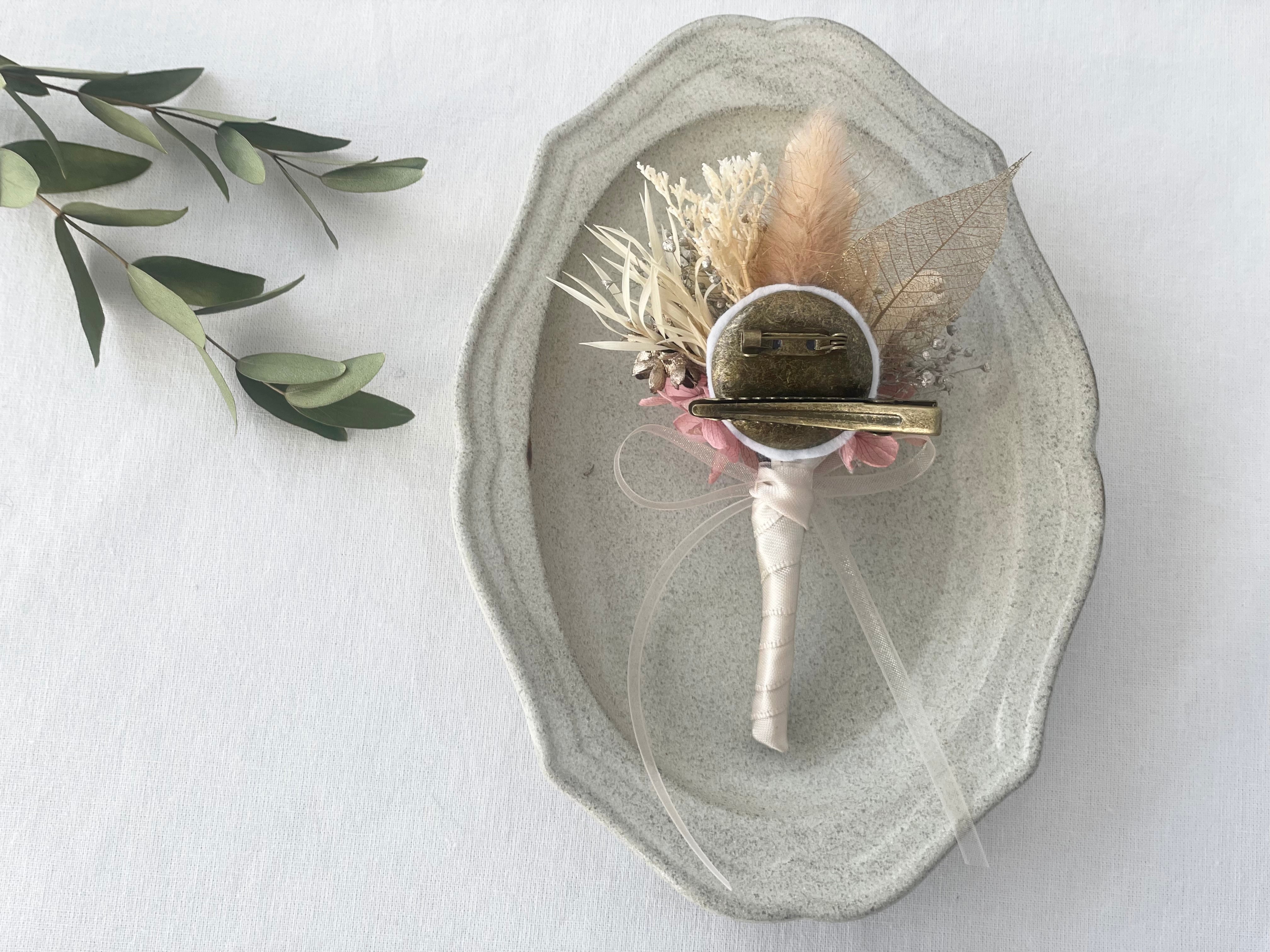 後ろにはクリップとコサージュピンがついておりますので付け外しも簡単です。