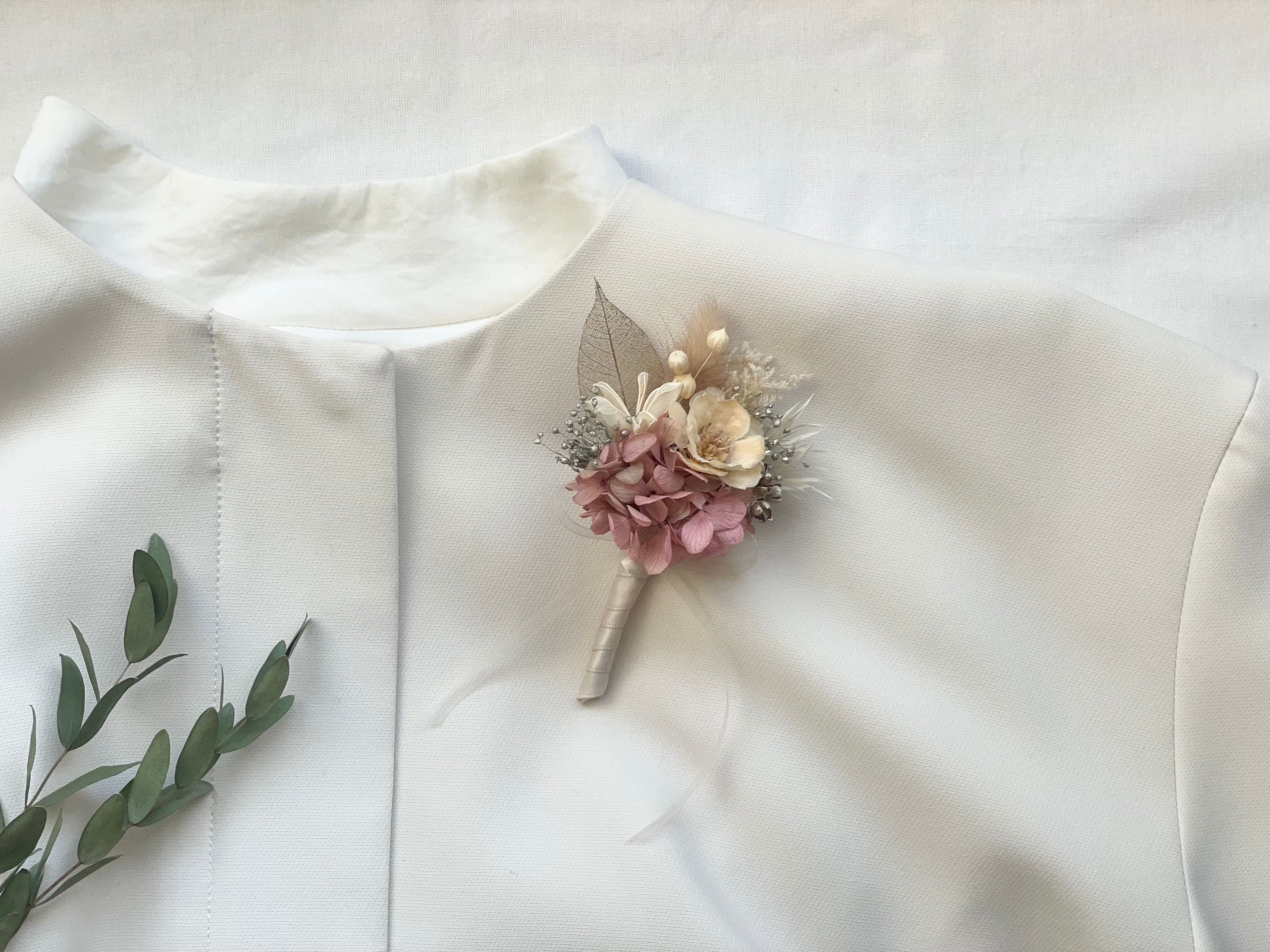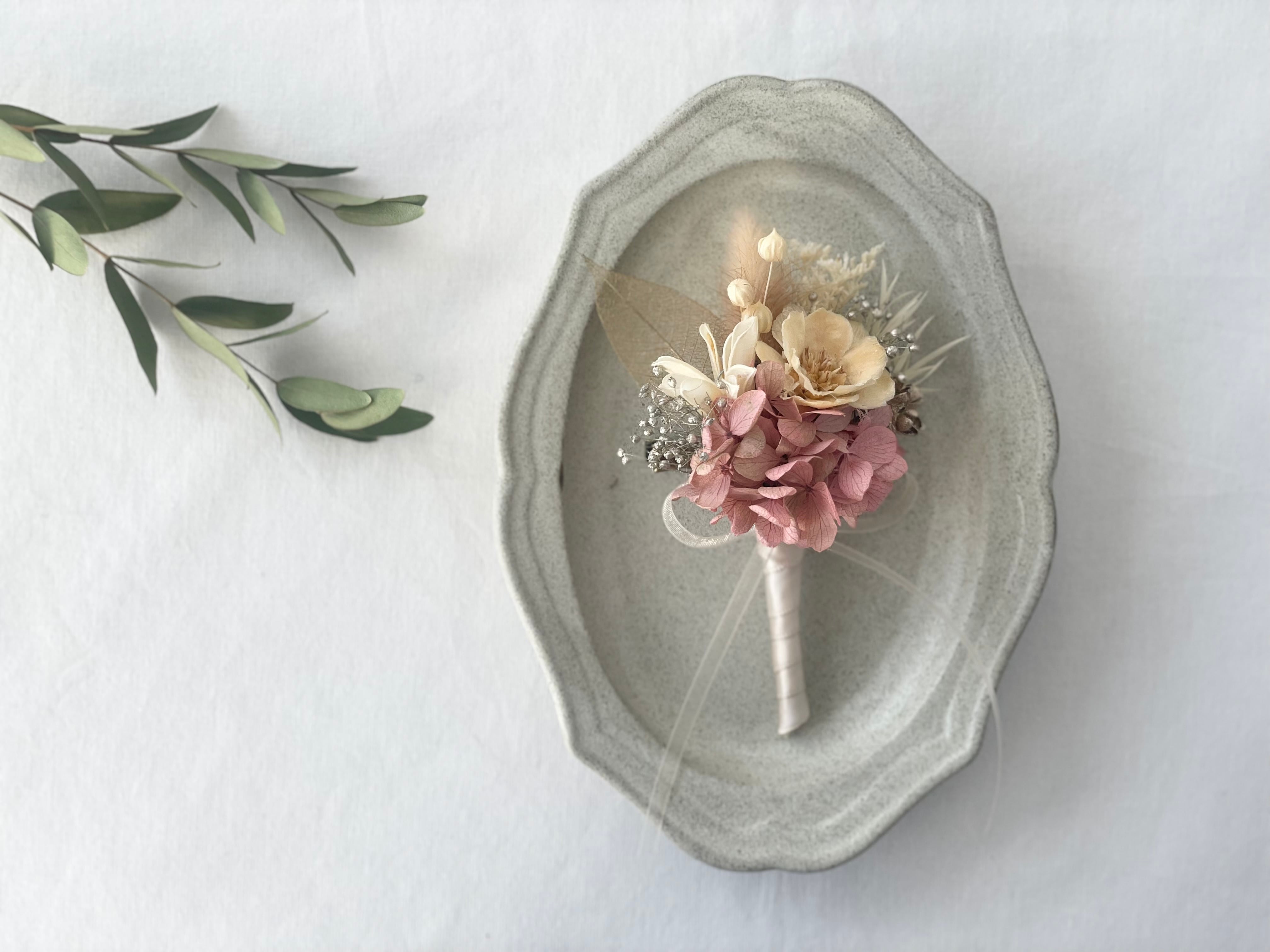 アンティークピンクとゴールドのプリザーブドフラワーを使ったコサージュです。